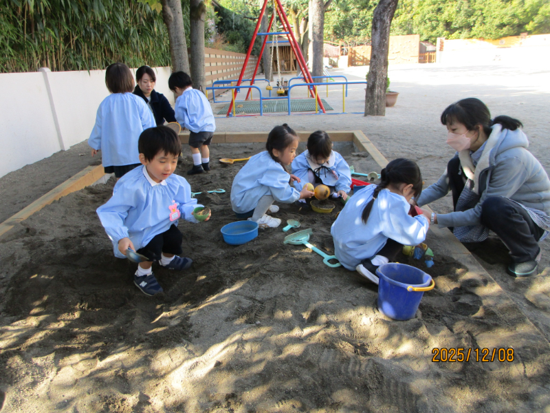 2025.12.02 チューリップの球根を植えました 今日はA組さんがチューリップの球根を植えました。「小さいお友だちが喜んでくれるかな?」「これは何色のお花が咲くのかな?」と子どもたちは会話を楽しみながら植えていました。人のために喜んで行うA組さんを見て嬉しく思った1日でした。 ※クリックすると拡大して表示されます